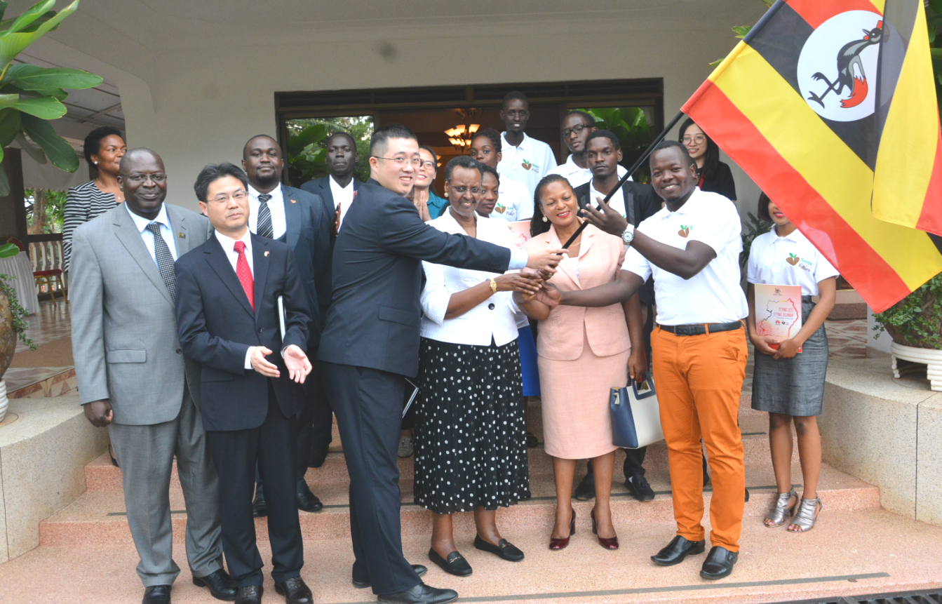 Mrs. Museveni (centre) and Ming jointly hand over the official flag to the leader of the group while Huawei’s Liujiawei (right) and others look on.