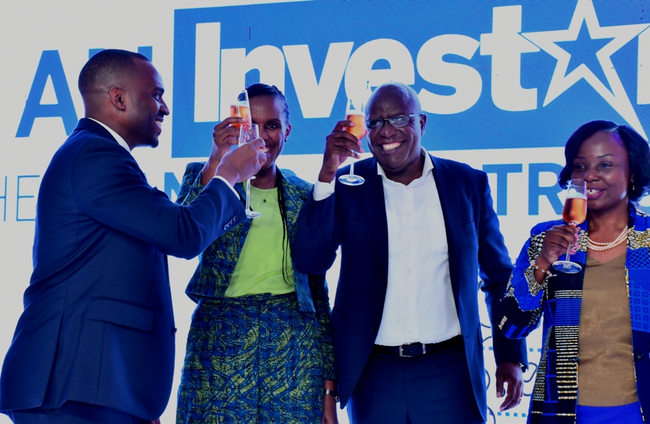 Semakula (left) Karuhanga and Konde (right) join other guests and staff to celebrate the launch of SUT which offers a low a risk investment experience for potential investors.