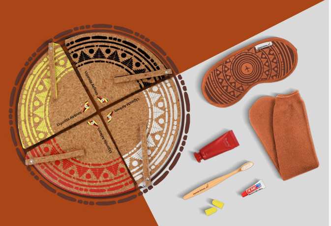 The kit, made by Bishkek, Kyrgyzstan – based Ferents & Co, features elements of backcloth is inspired by Uganda’s traditional textures and adorned with an embroidered golden crowned crane. Inside, travelers will find eco-friendly items including a bamboo toothbrush, earplugs in a craft flow pack, natural moisturizing face and hand creams from Bueno, a sleep mask, and cozy socks.